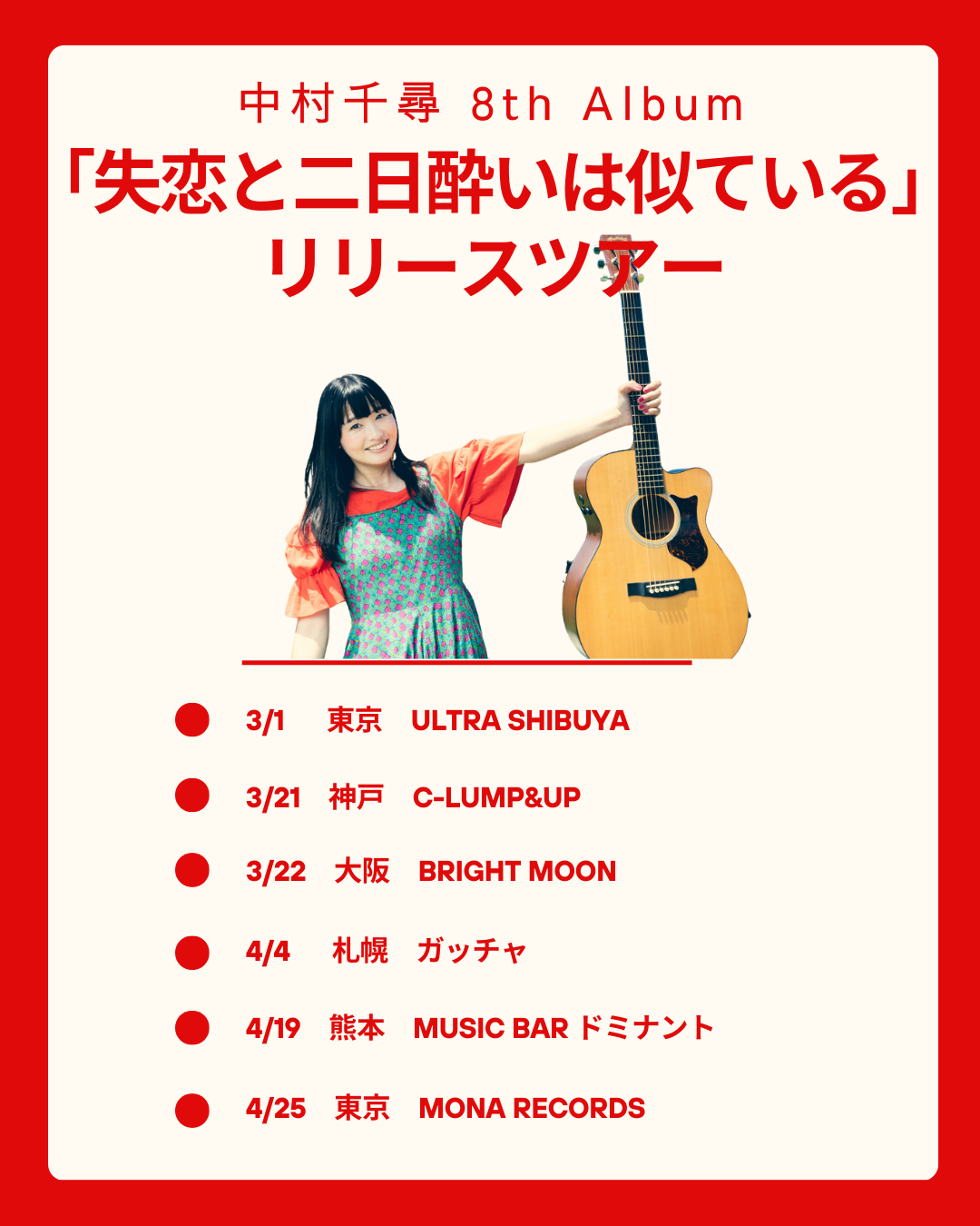 中村千尋 8th Album「失恋と二日酔いは似ている」リリースツアーの開催が決定!!!